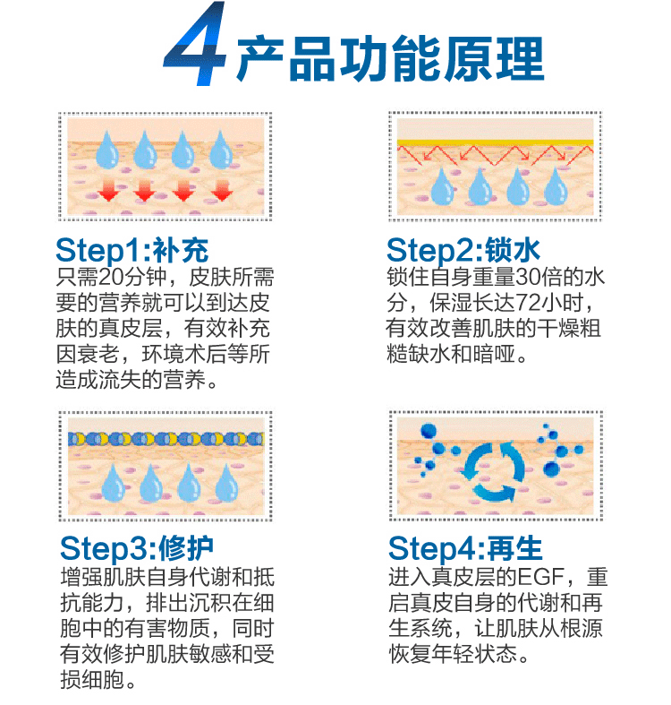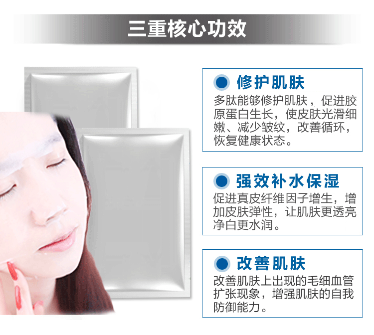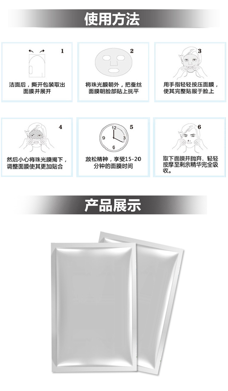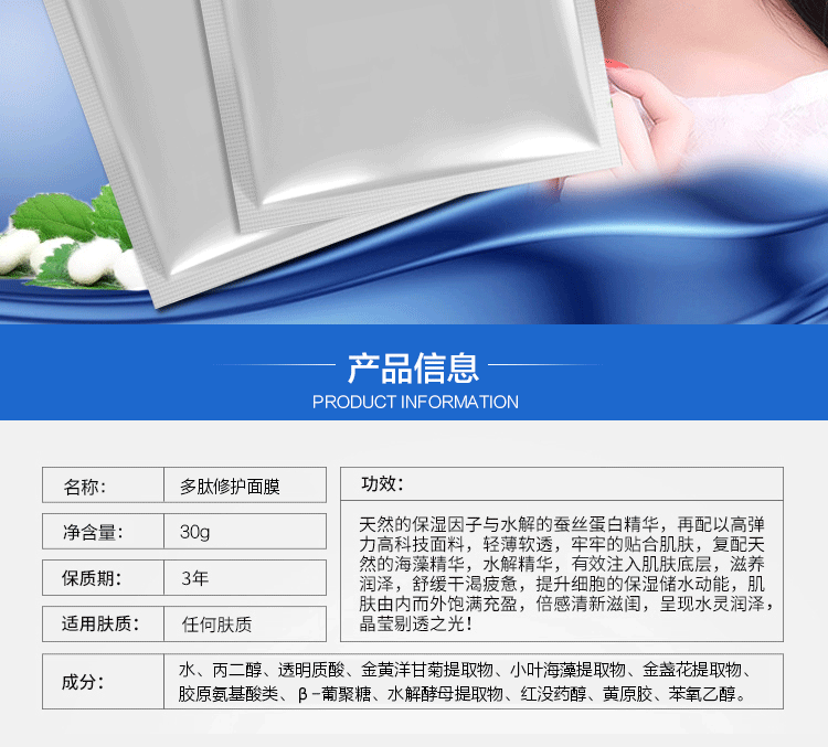 【產品功效】:天然的保濕因子與水解的蠶絲蛋白精華,再配以高彈力高科技面料,輕薄軟透,牢牢的貼合肌膚,復配天然的海藻精華,水解精華,有效注入肌膚底層,滋養潤澤,舒緩干渴疲憊,提升細胞的保濕儲水動能,肌膚由內而外飽滿充盈,倍感清新滋閨,呈現水靈潤澤,晶瑩剔透之光!