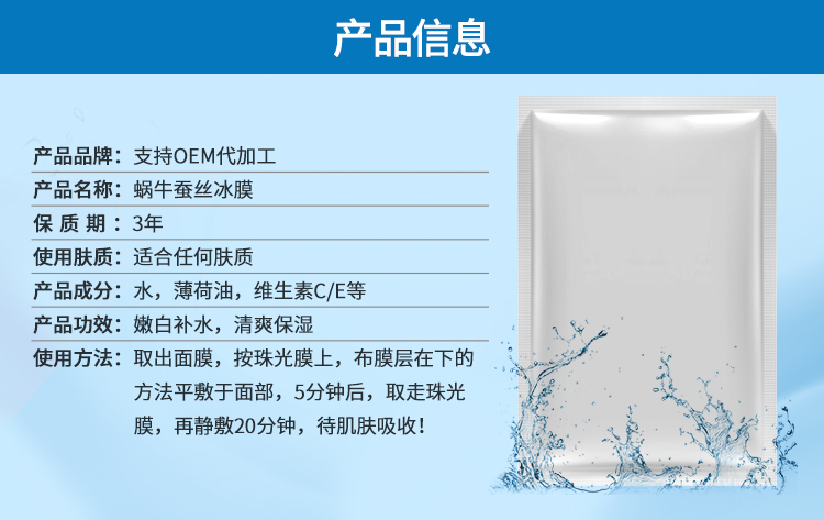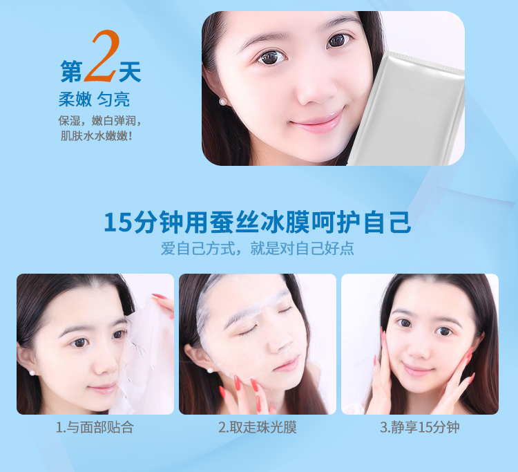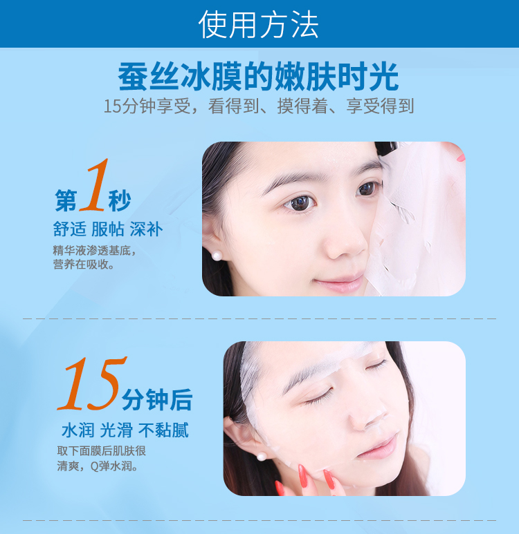 【使用方法】:取出面膜,按珠光膜上,布膜層在下的方法平敷于面部,5分鐘后,取走珠光膜,再靜敷20分鐘,待肌膚吸收!