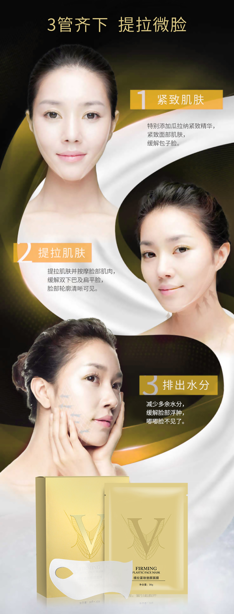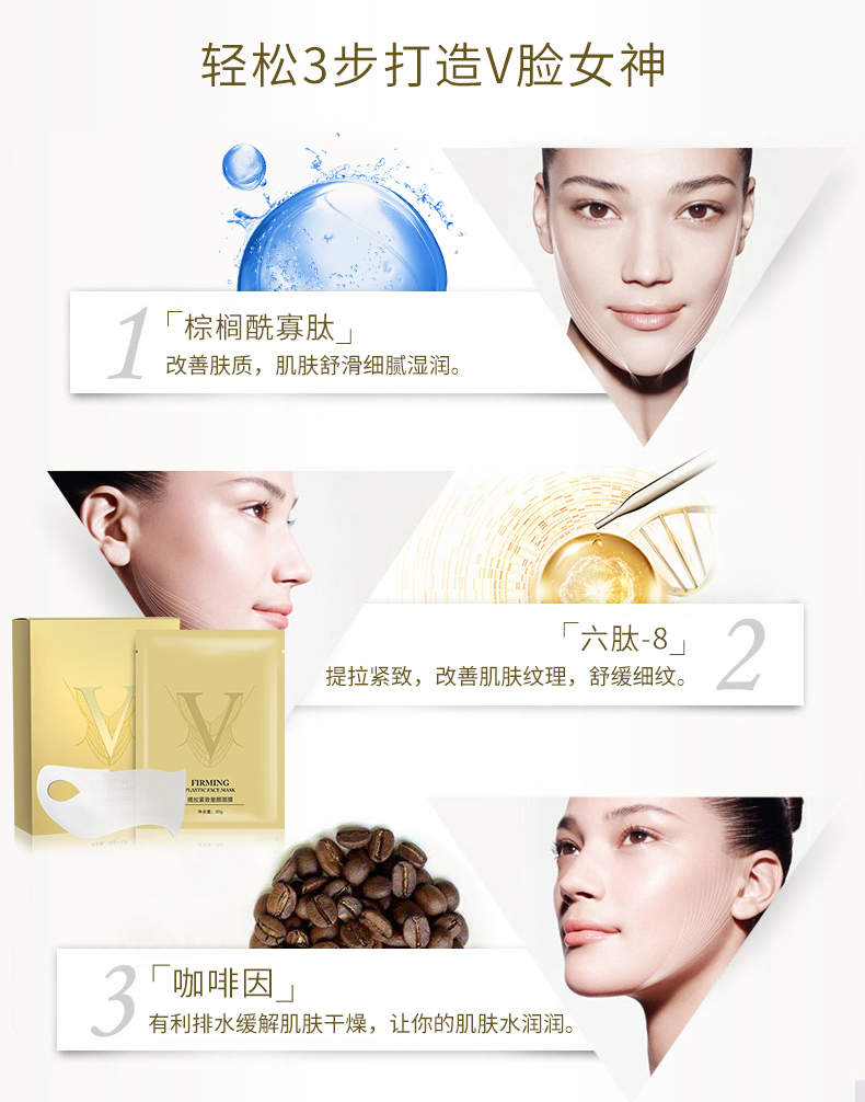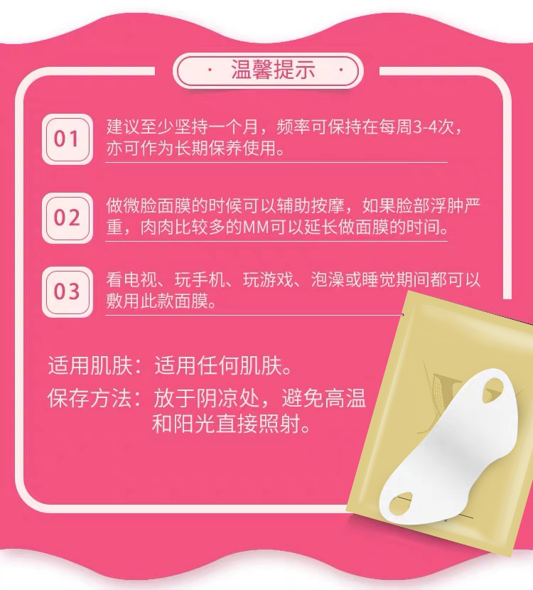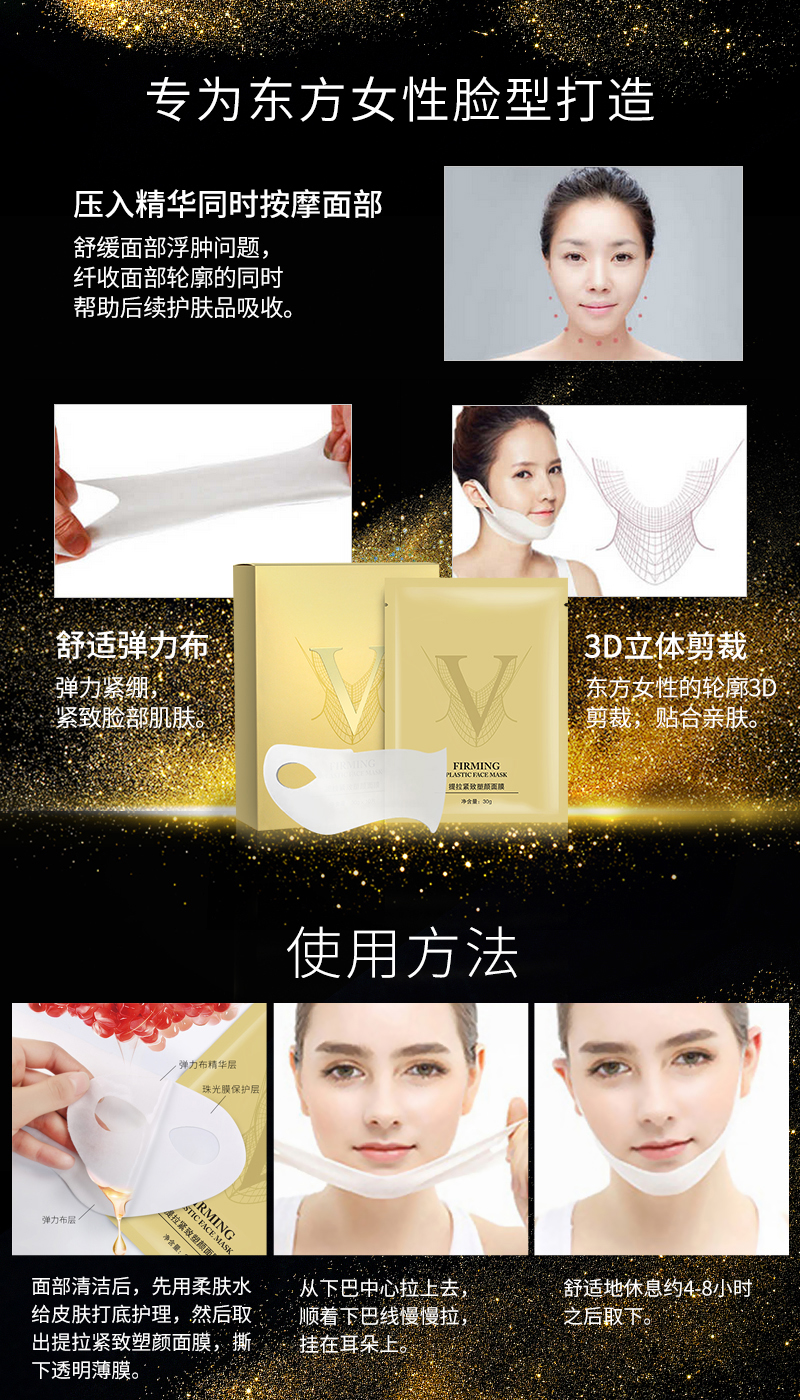 獨特的保濕凝膠成分給予肌膚清新舒適的感覺,彈力掛耳促使肌膚提拉緊致,并產生“密封壓強”的效果,讓面膜中精萃精華被肌膚吸收,可提升下巴兩頰肌膚,盡顯臉部緊致的青春魅力。