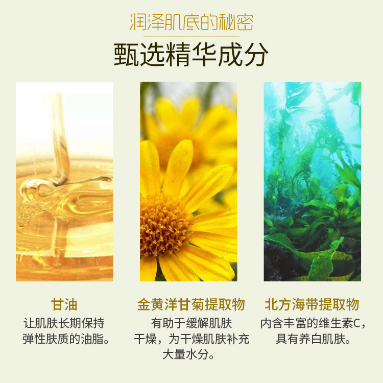 【產(chǎn)品成分】:刺云實(shí)膠、甘油、金黃洋甘菊提取物、北方海帶提取物、巨藻提取物、霍霍巴籽油。