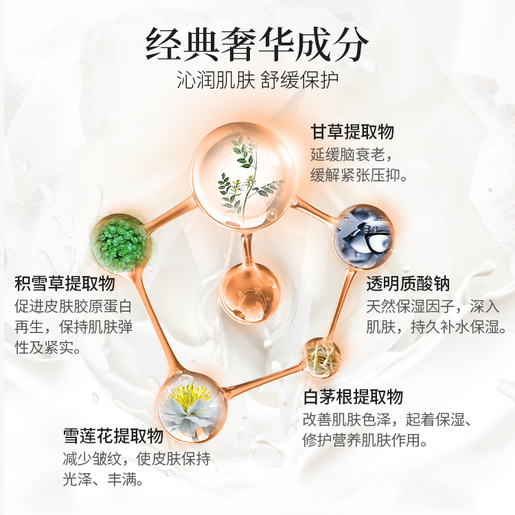 【產品成分】:水、甘油、白果槲寄生葉提取物、白茅根提取物、雪蓮花提取物、甘草提取物、積雪草提取物、透明質酸鈉。