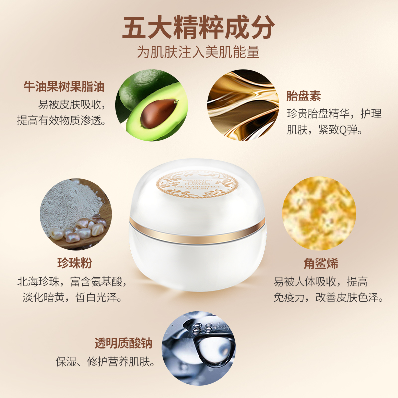【產品成分】:牛油果樹果脂油,角鯊烯,胎盤素、透明質酸,珍珠粉,生育酚等