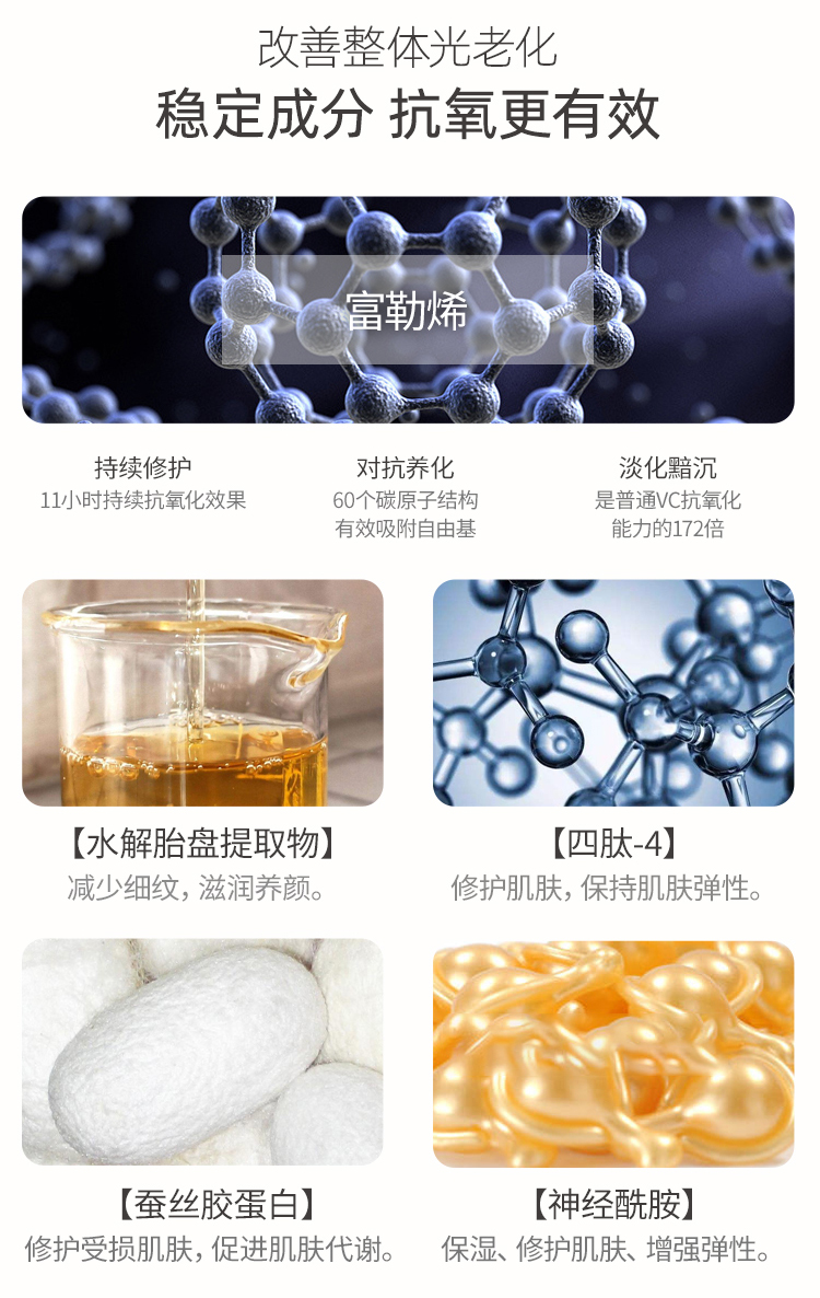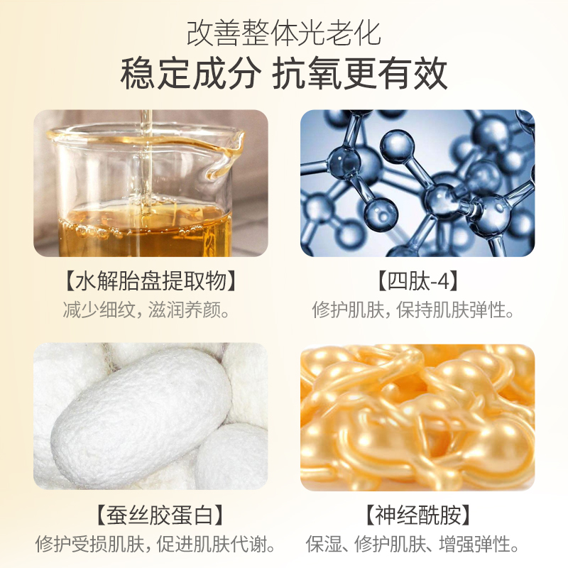 【產(chǎn)品成分】:水解胎盤提取物、富勒烯、四肽-4、蠶絲膠蛋白、神經(jīng)酰胺 1等。